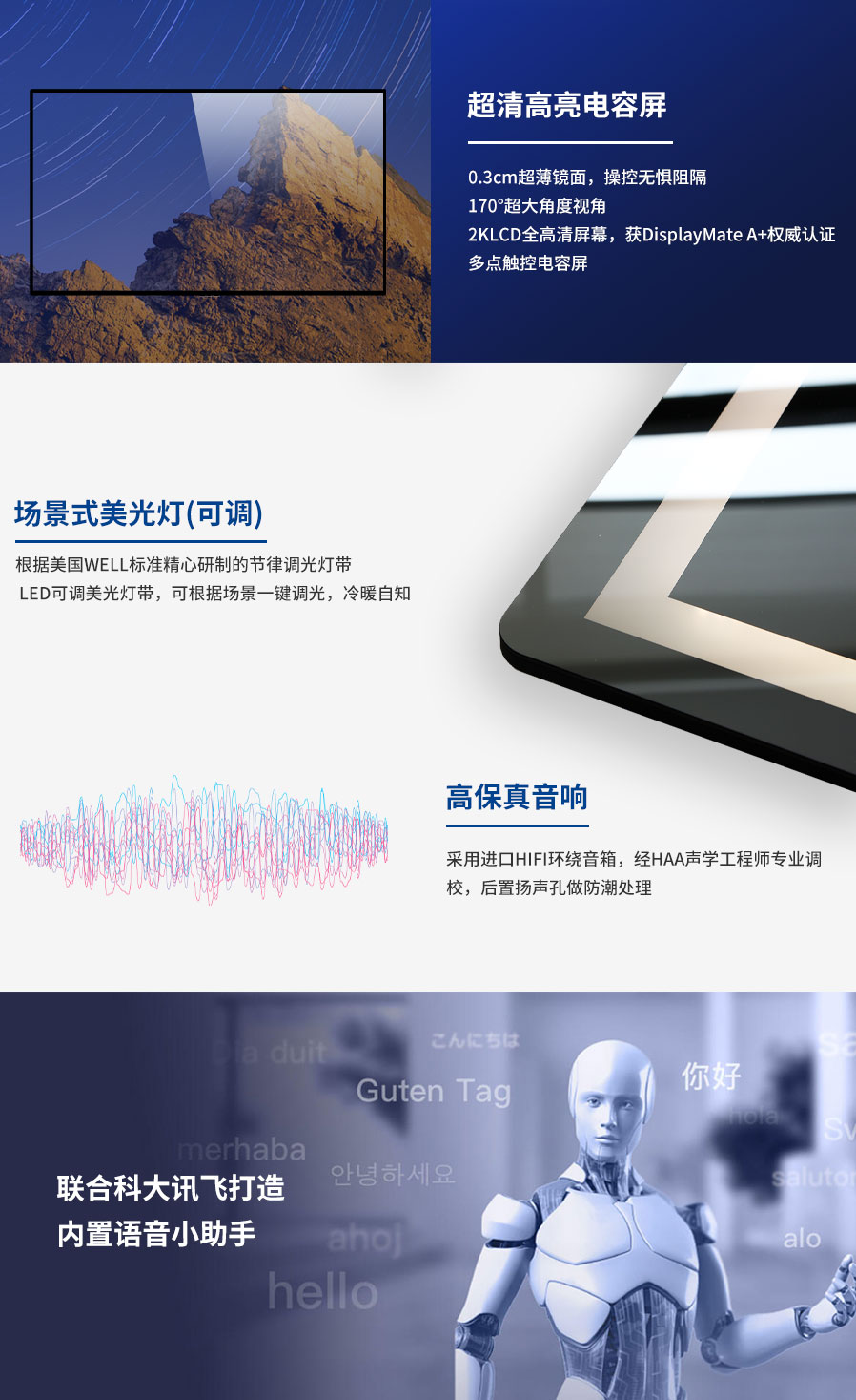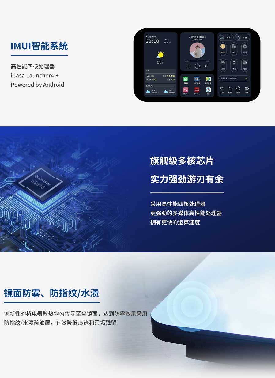 IM-75H系列智能魔鏡搭載愛家仕新科技-健康節(jié)律照明系統(tǒng),根據(jù)日夜星辰的變化自動調(diào)節(jié)燈光方案。產(chǎn)品防霧防潮,支持一鍵場景,手機投屏等功能。
