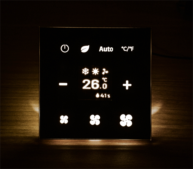 優(yōu)質(zhì)鋼化玻璃材質(zhì),光潔通透 支持溫濕度調(diào)節(jié)和風(fēng)速調(diào)節(jié) 支持一鍵節(jié)能 支持?jǐn)z氏度和華氏度一鍵切換 系統(tǒng)級(jí)解決方案,可與RCU產(chǎn)品對(duì)接